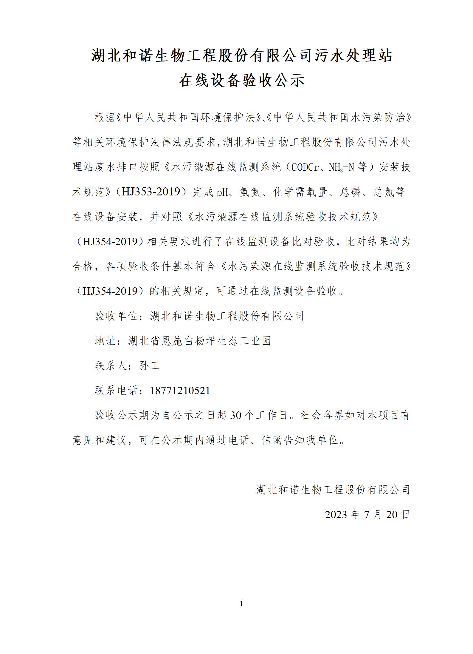 湖北和諾生物工程股份有限公司污水處理站在線設(shè)備驗(yàn)收公示